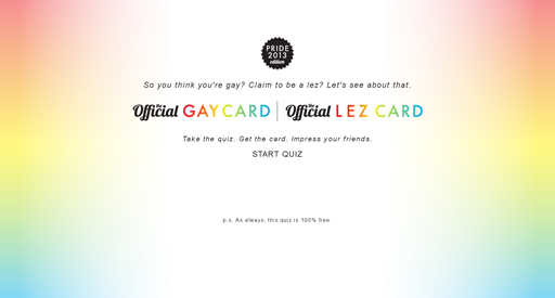 For three years running, Christopher Rouleau and I collaborated on this site. The user takes a quiz and is offered their 'Official Gay Card' at the end. This was done in honor of Toronto Pride Week. It was a pleasure to work on this project. The most engaging part from a coding perspective was the functionality of the quiz (try it out!)