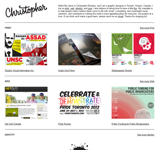 This is the professional portfolio of Toronto designer, Christopher Rouleau. His aim for the site was to showcase multiple images of his varied work. The design solution we came up with allows both browsing through projects within a category and browsing multiple images within a project.