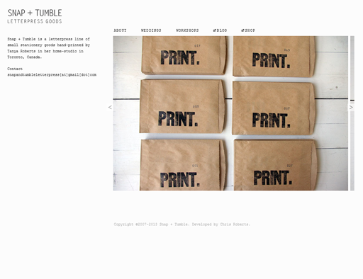 Snap + Tumble is a letterpress line of small stationery goods hand-printed by my wife, Tanya Roberts in her home-studio, here in Toronto, Canada. The main feature of this site is the image carousel, for which the goal was a simple, intuitive design.
